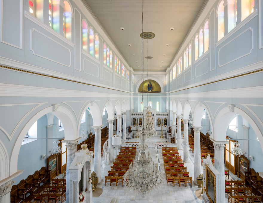The Holy Church of Agios Nikolaos in Pyrgos, Ilia, is the metropolitan church of the city and has been designated as a "Monument of Modern Cultural Heritage". It is a typical example of ecclesiastical architecture of the end of the 19th century and the beginning of the 20th century, with various neoclassical elements, both externally and internally, and is considered an important landmark for the history of the city of Pyrgos due to its architectural and archaeological value. The church was built in 1897 on the site of a pre-existing church, but it was inaugurated in 1906. It is a three-aisled basilica with two belfries to the west. The nave of the church, which is elevated compared to the side aisles, and it is covered with a saddleback wooden roof, while the lateral aisles have lean-to roofs. To the west is found the narthex with the central entrance. At the upper part of the narthex are two gynaeconites, placed at different levels. The interior decoration of the temple is dominated by marble.